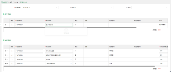 在新建生產(chǎn)單時(shí),選擇成品與原料可通過(guò)選擇生產(chǎn)BOM來(lái)快捷選擇。