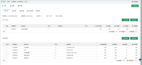 在生產(chǎn)單列表,會(huì)顯示全部生產(chǎn)單。在生產(chǎn)單詳情界面,可實(shí)現(xiàn)領(lǐng)料、退料、產(chǎn)成品入庫(kù)并可快速流轉(zhuǎn)生成工單。