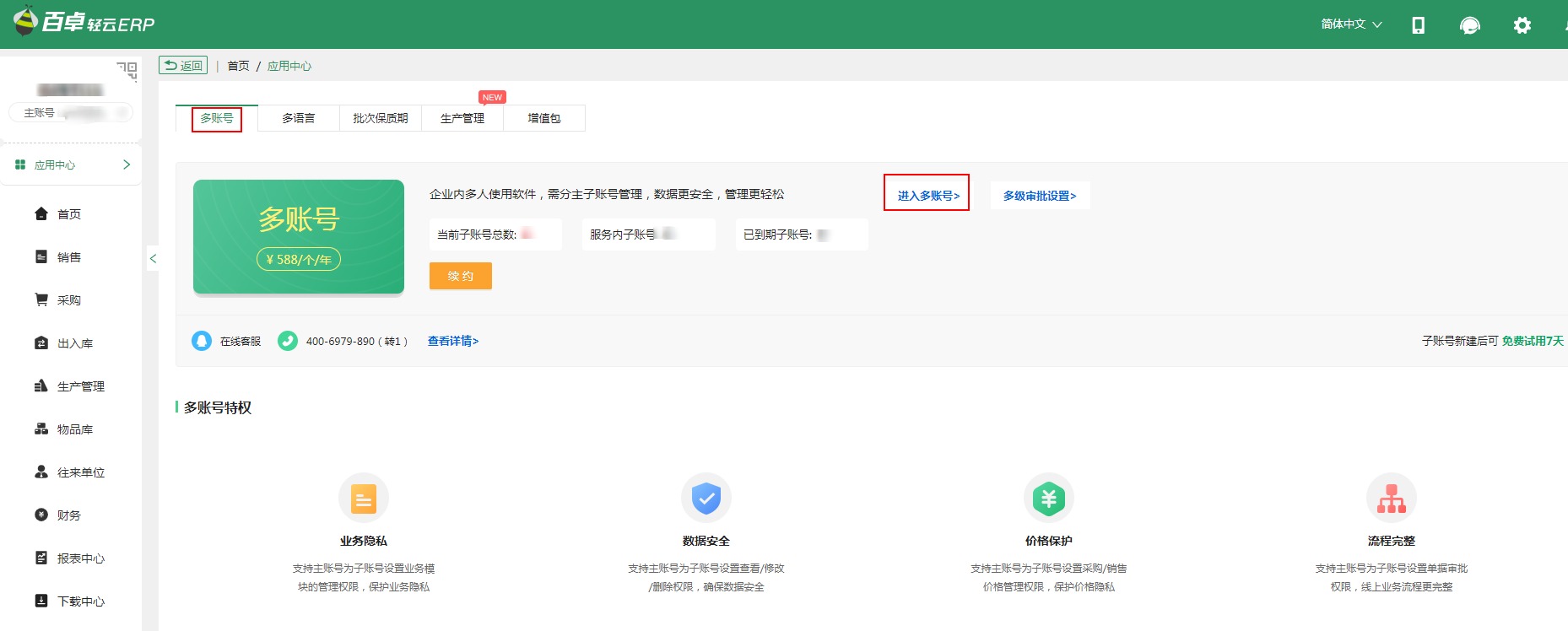 百卓輕云ERP軟件—進(jìn)銷存增強(qiáng)版:主賬號(hào)使用費(fèi)用為1888元/年,子賬號(hào)權(quán)限為vip服務(wù),1個(gè)子賬號(hào)是1000元/年(含稅),可加購多個(gè)子賬號(hào)。